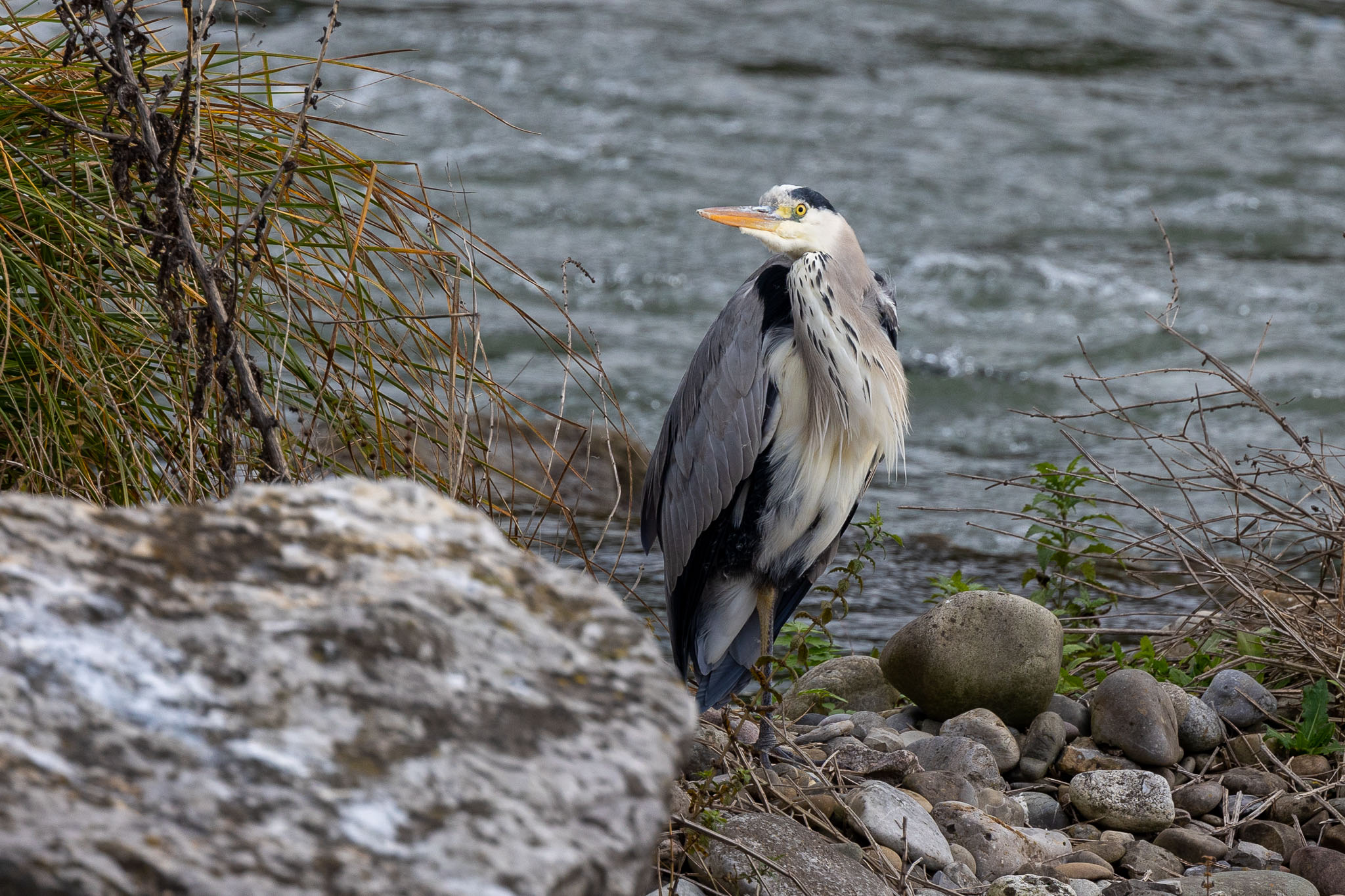 Blauwe reiger (Graureiher); Rheinfelder Stau