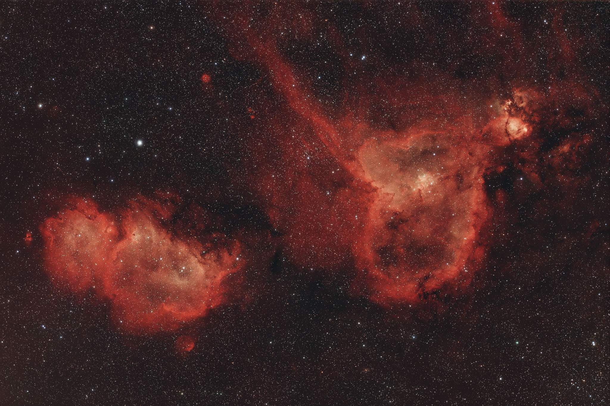 IC1805 & IC1848, Heart and Soul Nebula, ↕ 7500 LY, Ø 150', ☼ 6.2, 350 mm, ƒ3.9, ISO 1600, 145x3 min Ha+OIII, # 34x22 mm, Bernau BW (Bortle 4.2; 6x), 29.08.24