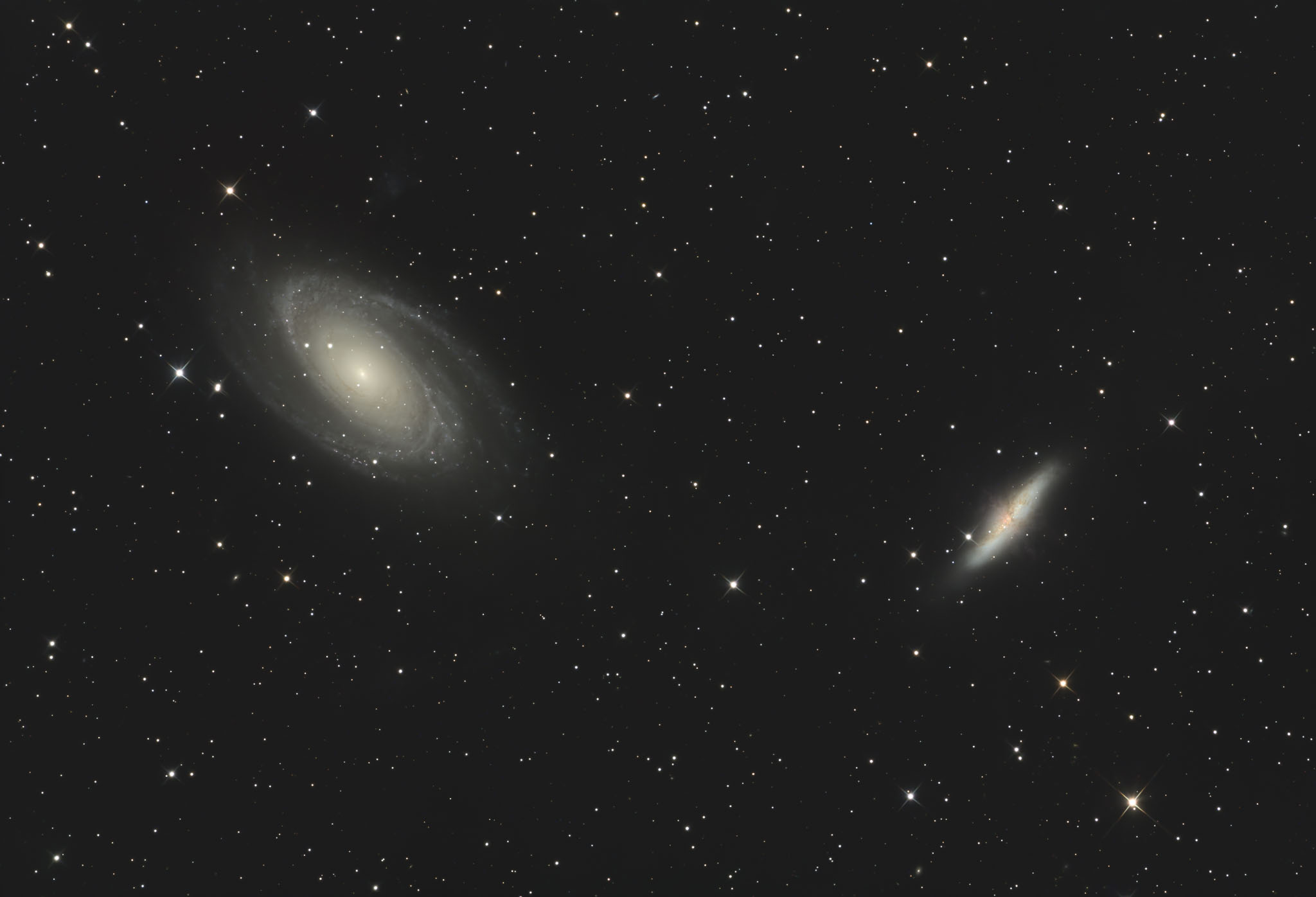 M81 & M82, Bode's galaxy, ↕ 12 Mio LY, Ø 21'x10', ☼ 6.9, 900 mm, ƒ7, Gain 100, 30x5 min, # 19x12 mm, Lauwersoog (Bortle 4.2; 6x), 23.06.22